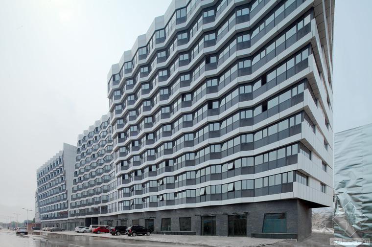 建筑的底層是展廳和商業(yè)。公寓部分在二層以上,大約占總建筑面積的三分之二,因分屬于三個(gè)投資人,業(yè)主希望從形式上有區(qū)分,突出各自的獨(dú)立性。我們以公寓面寬為基準(zhǔn)定義出一個(gè)標(biāo)準(zhǔn)戶型的外觀形式,在南立面上進(jìn)行重復(fù),通過基本單元有序的懸挑形成錯(cuò)動(dòng),發(fā)展出水平和垂直方向富有動(dòng)感的體量變化,進(jìn)而強(qiáng)調(diào)出辦公和兩部分公寓的清晰分界。于是集合體明確地呈現(xiàn)出四部分,一個(gè)底座和上面三個(gè)起伏的體塊,為內(nèi)容的不同提供了明顯的標(biāo)識(shí)。