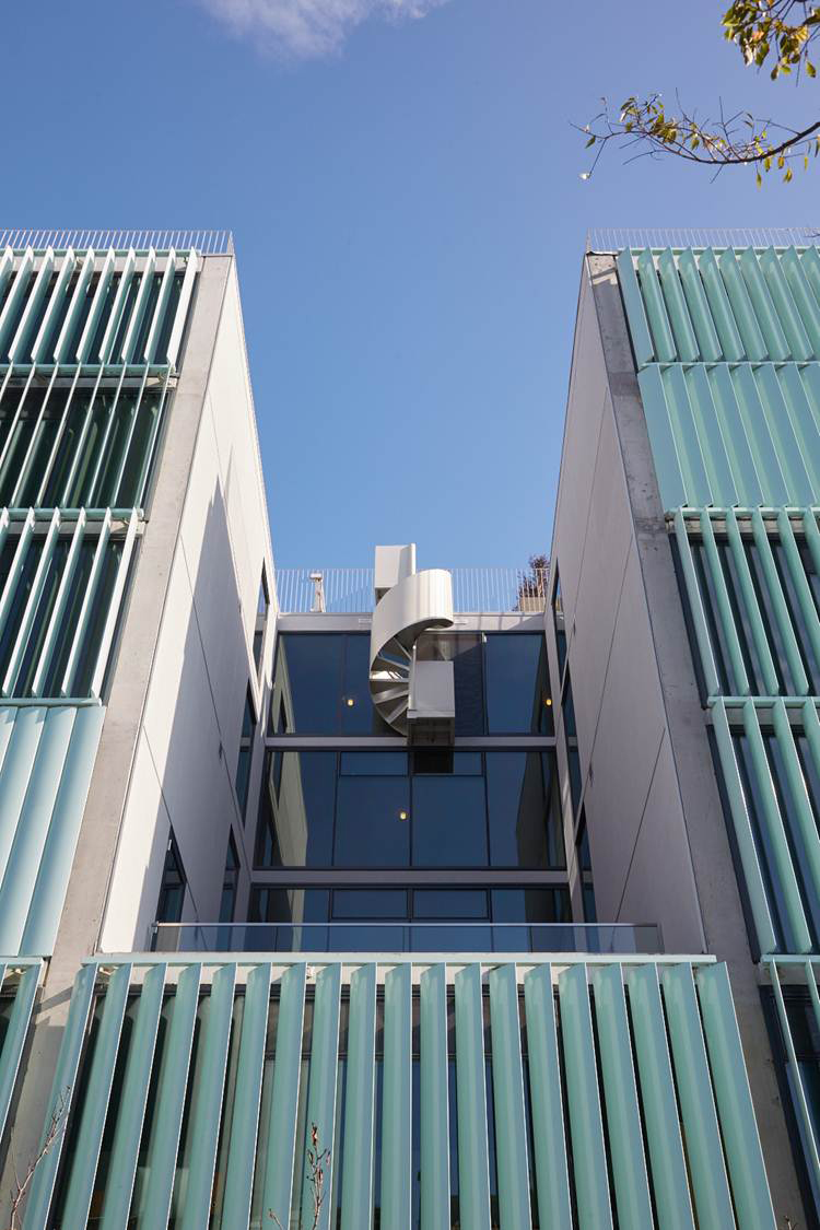 8 Octavia毗鄰101公路,成為進入舊金山的地標性建筑。由住戶自由操作的百葉窗,讓建筑立面展現(xiàn)出變化的形象。為了更有效的利用空間,建筑采用復式設計,且每個單元中間包含一個中庭。建筑設備隱藏在墻壁內(nèi),為居住者提供足夠的可利用給空間。場地位于101公路與城市道路的連接處,這里也是舊金山西北區(qū)的入口。The First Baptist Church教堂的典型立面及顯著的檐口是這棟建筑的顯著標志。與其相反的,在Octavia Boulevard大道的另一邊,8 Octavia完善了城市的入口景觀。這棟地標性建筑以其傳統(tǒng)又創(chuàng)新的外貌,成為舊金山的新地標。細長的建筑體量在街道上延展,并在兩端形成商業(yè)區(qū)。傳統(tǒng)上的舊金山街道立面都較為精致,賦有精巧繁復的立面裝飾,除此之外,這些當代建筑需用較低的能量消耗和較少的材料來滿足居住的需求。建筑外表皮需具備自我調(diào)節(jié)能力,隨著時間和季節(jié)的變化做出相應改變,并適時的調(diào)整室內(nèi)環(huán)境氣候。在建筑的西立面,每一戶居住著都可以通過調(diào)整外立面百葉窗來控制自家的太陽光照強度,噪音大小,并同時改變著外立面圖案。這種不統(tǒng)一的變化如同指示牌,不斷映射著居住者的生活狀態(tài)。