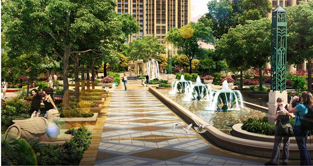 整個(gè)建筑規(guī)劃呈現(xiàn)沿中軸對(duì)稱布置的規(guī)劃手法,意在打造強(qiáng)烈的禮儀感規(guī)劃布局,營(yíng)造舒適的空間氛圍。結(jié)合規(guī)劃布局特點(diǎn),打造對(duì)稱規(guī)則的中央景觀,切合禮儀感的規(guī)劃特點(diǎn)。