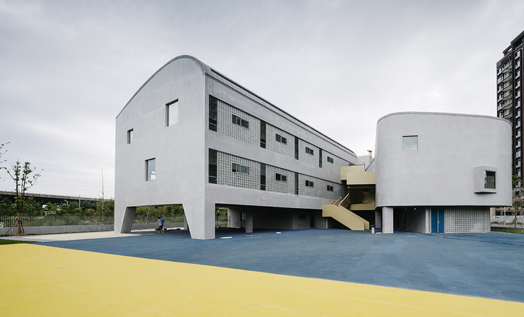 北側(cè)的城市界面較為齊整但不失活躍,幼兒園的圍墻沒有完全貼合紅線,而是向內(nèi)設(shè)置了多處轉(zhuǎn)折,在步行道旁留出了駐足的空間,在入口處后退,留出了家長等候的場地。同時將部分綠地讓出給城市界面共享,以減少對街道的壓迫。圍墻不僅僅是出于安全要求的設(shè)計,更是建筑與街道之間的緩沖,在低視角處增加了步行空間的樂趣,形成積極的連續(xù)界面。而在高視角的建筑界面,將日常中容易被忽視卻頻繁使用的樓梯間,作為獨立的語匯提取出來,在北側(cè)界面穿插進不同顏色和尺度的體量,也讓南側(cè)活動室之間的空間更緊湊。盡端以一個多功能廳的弧形輪廓收尾,自然緩和的過渡到室外的活動場地。北側(cè)界面在高低有序、材料統(tǒng)一的前提下,調(diào)節(jié)街道面的節(jié)奏感,避免狹窄的場地中連續(xù)體量帶來的緊張感。在高層住宅林立的背景前,留給行人和幼兒一個親和的街道面,將幼兒園內(nèi)部的溫馨環(huán)境和適宜尺度,也延續(xù)至立面和街道。