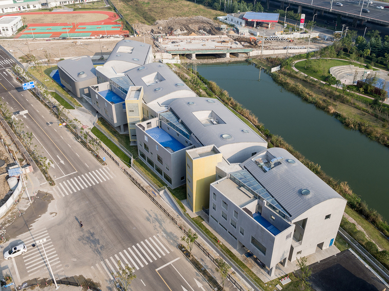 幼兒園是孩子們在成長過程中第一個接觸的公共空間。空間的尺度、使用的靈活度以及室內(nèi)的場景和氛圍,對于幼兒的感受和認知都有很大影響,對于建筑師也是一個挑戰(zhàn)。設(shè)計要能激發(fā)孩子們探索和學(xué)習(xí)的興趣,同時要給他們足夠的安全感,要有家的感覺。在調(diào)研期間,設(shè)計團隊也發(fā)現(xiàn),非正式空間-如活動室前的走廊-往往是孩子們生活、交往、嬉戲的重要場所。功能、空間與環(huán)境的關(guān)系,是本案在設(shè)計初始所面臨的主要矛盾和核心議題。張江萬科實驗幼兒園位于一個狹長的三角形地塊?;啬蟼?cè)為中環(huán)路高架與河道綠化,北側(cè)為高層住宅區(qū),東側(cè)為一座跨河道的車行橋,西側(cè)則為一棟需要容納在場地內(nèi)的區(qū)域環(huán)網(wǎng)站。要做出一個回應(yīng)場地限制條件并符合教育局規(guī)范標準的15個班全日制幼兒園,這塊特殊的基地便顯得極具挑戰(zhàn)性。建筑師需要在滿足規(guī)劃指標、使用面積、規(guī)范性、安全性等硬性要求的前提下,在一個相對局促的場地里,創(chuàng)造出符合老師教學(xué)管理、誘發(fā)兒童探索心理、和滿足家長預(yù)期的幼兒園。