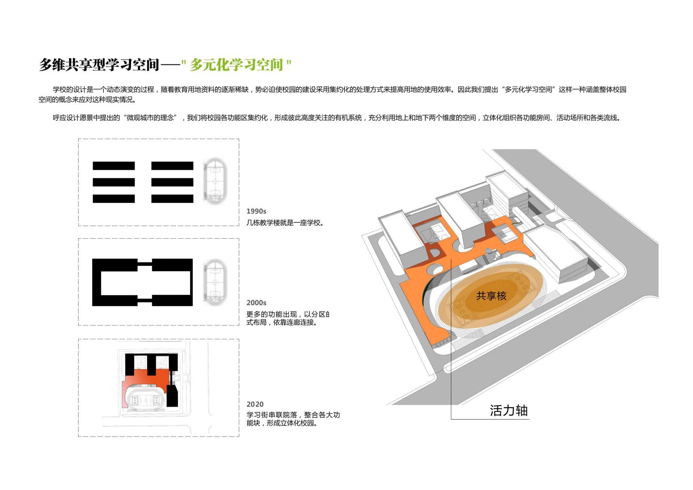 “雙地下”概念是將操場以下的土地進行有效利用,將2F綜合樓地下以及操場地下一層作為食堂使用,內(nèi)部包含廚房以及教職工食堂,建筑面積為5460平方,可容納3000人。將食堂的北側(cè)以及西側(cè)設(shè)置6M以上寬的下沉庭院,解決食堂的采光通風(fēng)問題,也結(jié)合樓梯踏步與景觀設(shè)計增加學(xué)生的趣味性。第二個地下就是學(xué)校西側(cè)地下一層作為教師的內(nèi)部停車庫,可停放200輛車輛,面積為7500平,操場的地下二層設(shè)置地下接送系統(tǒng),作為家長接送孩子的專用停車庫,可停放160輛車輛,面積為5200平方,內(nèi)部設(shè)置閘機,家長等候區(qū),閱讀區(qū),學(xué)生刷卡出校后家長手機會接收到短信,便捷的接送到孩子。緩解了學(xué)生上下學(xué)學(xué)校附近的交通壓力。