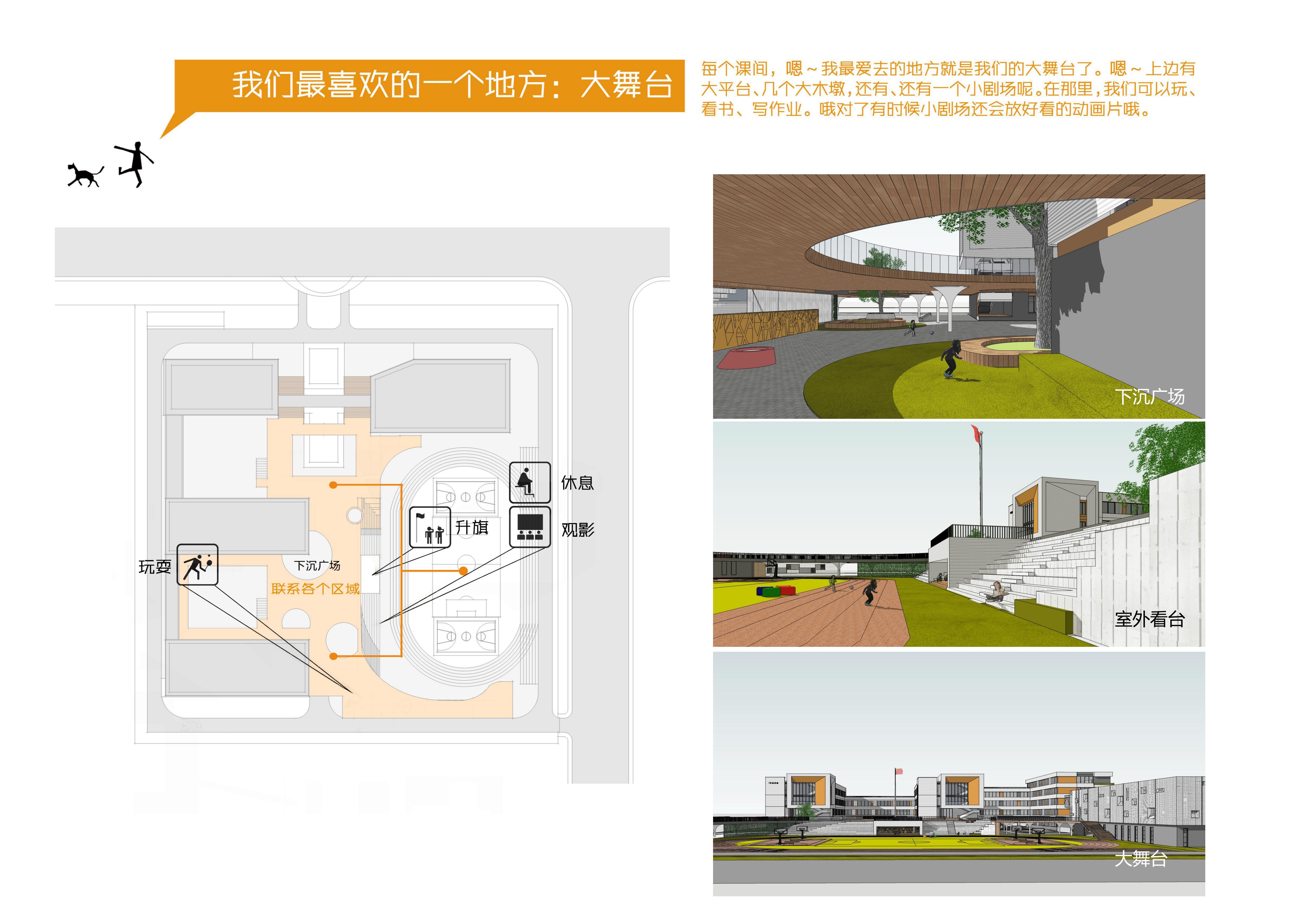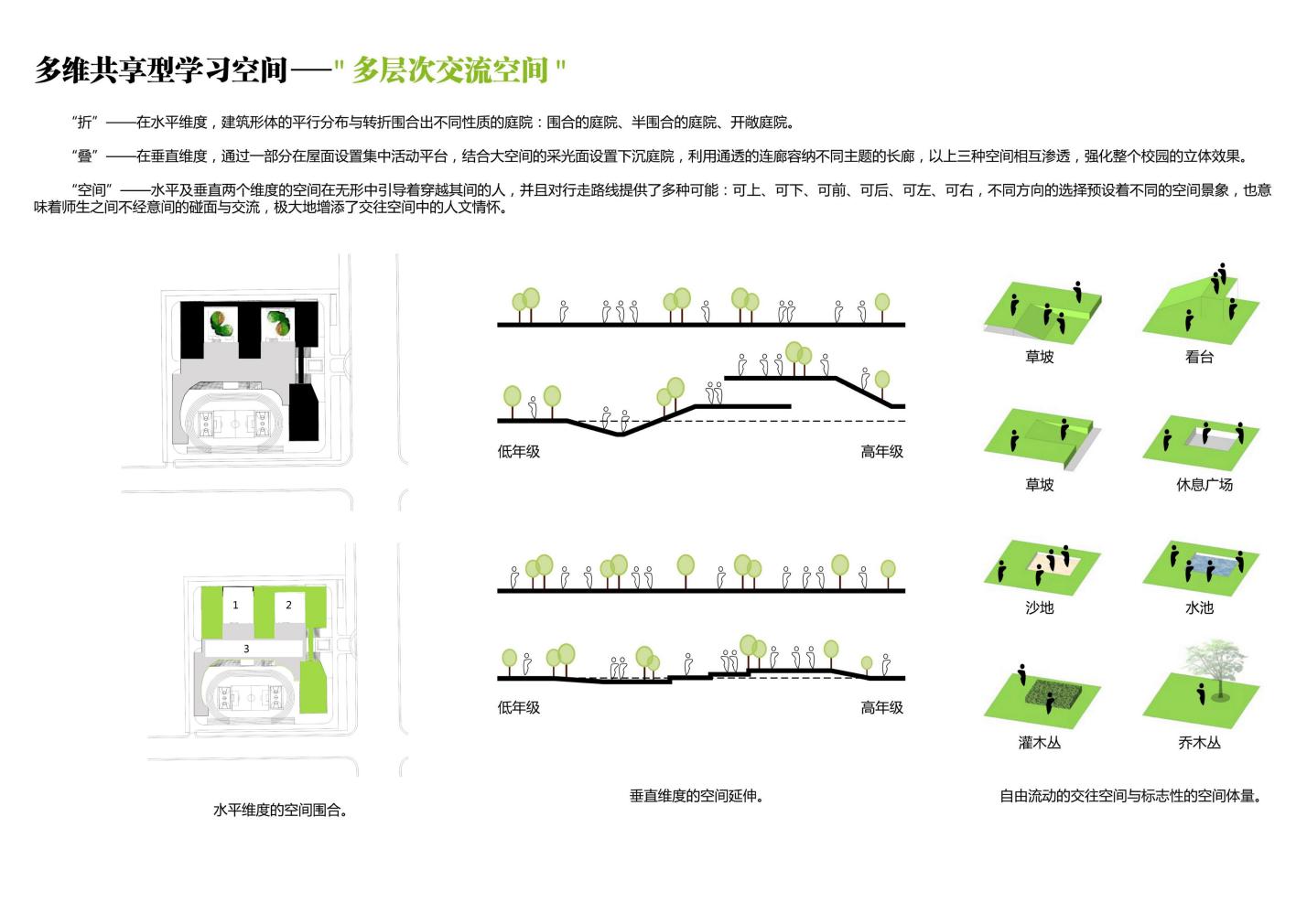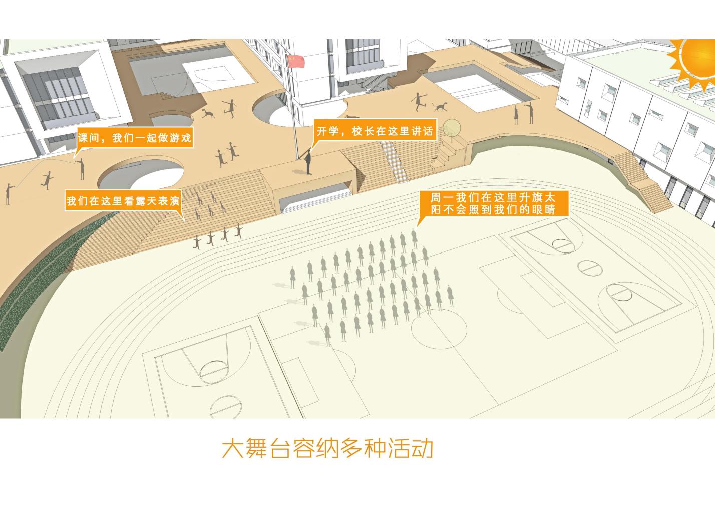 “雙首層”概念是將學(xué)校地上中心部分,局部進行一層架空懷抱住操場,架空平臺按照一半面積計算為1100平方,平臺上設(shè)置多個采光井,與景觀設(shè)計融為一體,形成學(xué)生的二層活動空間,與教師增加更多學(xué)習(xí)交流的互動空間,平臺下設(shè)置了功能房間,一個400平圖書閱覽室,2個音樂教室,1個舞蹈教室,一個體育器材室以及公廁。也形成了學(xué)生的一層活動空間,這樣解決了學(xué)生多活動場地少的難題,也解決了舞蹈音樂教室對普通教室教學(xué)引起的噪音污染問題。